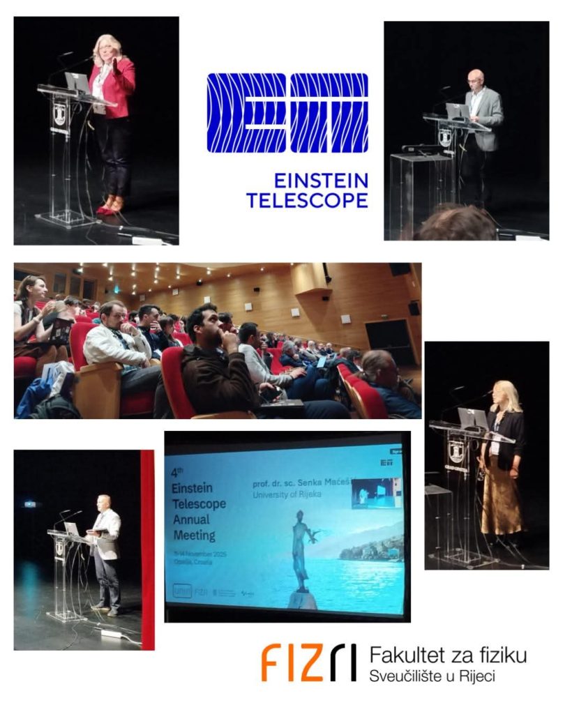 Četvrti godišnji sastanak kolaboracije za teleskop Einstein započeo je danas u Opatiji. Više od 130 članova međunarodne kolaboracije sudjeluje na ovom važnom sastanku kako bi raspravljali o planovima i znanstvenom potencijalu teleskopa Einstein. Hrvatska se nedavno pridružila kolaboraciji Einstein Telescope i vrlo smo ponosni što smo prvi put domaćini godišnjeg sastanka. Jutros su sudionike pozdravili voditelj lokalnog organizacijskog odbora, prof. dr. sc. Marin Karuza, dekanica Fakulteta, prof. dr. sc. Rajka Jurdana-Šepić, prorektorica prof. dr. sc. Senka Maćešić i dr. sc. Hrvoje Meštrić iz Ministarstva znanosti, obrazovanja i mladih.