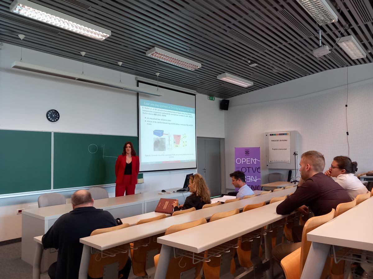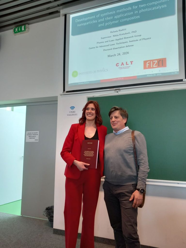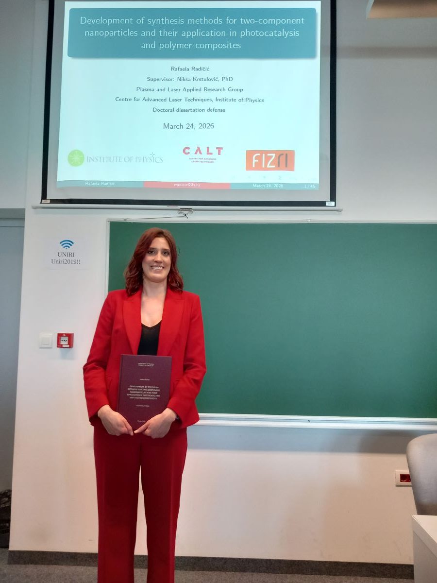 Rafaela Radičić, studentica doktorskog studija Fizika, Fakulteta za fiziku Sveučilišta u Rijeci, obranila je doktorski rad pod mentorstvom dr. sc. Nikše Krstulovića, znanstvenog savjetnika s Instituta za fiziku Zagreb u utorak, 24. ožujka 2026. godine. Naziv doktorskog rada je DEVELOPMENT OF SYNTHESIS METHODS FOR TWO-COMPONENT NANOPARTICLES AND THEIR APPLICATION IN PHOTOCATALYSIS AND POLYMER COMPOSITES.