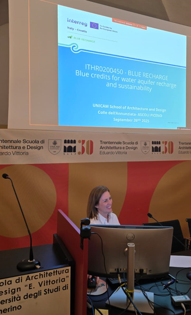 Dana 26. rujna 2025. na Fakultetu za arhitekturu i dizajn Sveučilišta u Camerinu (Ascoli Piceno, Italija) Diana Mance održala je predavanje kojim je publiku upoznala s glavnim ciljevima projekta BLUE RECHARGE, predstavila primjere dobre prakse upravljanog prihranjivanja vodonosnika u Italiji i Hrvatskoj te pružila uvid u trenutačno stanje studije slučaja koja se provodi u Hrvatskoj.