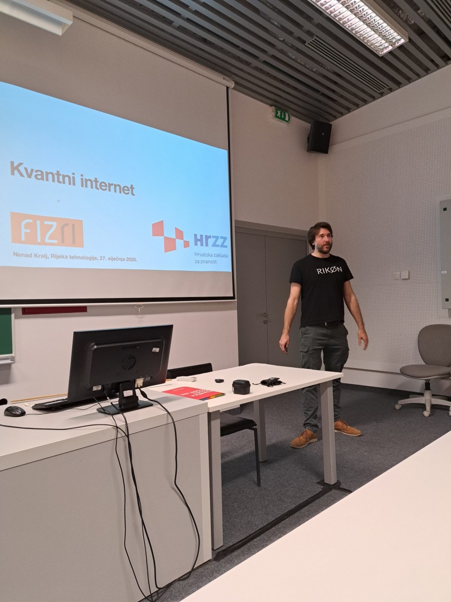 Nenad Kralj je u sklopu manifestacije Rijeka tehnologije 2025. održao popularno predavanje o naporima u smislu razvoja kvantnog interneta. Poseban naglasak stavljen je na kvantnu memoriju kao ključnu sastavnicu koja pospješuje prijenos kvantnih stanja, kao i na njezinu implementaciju u optičkoj šupljini s membranom u sredini, u sklopu projekta MIMIQ.ME. Više informacija o programu može se naći na poveznici https://socri.uniri.hr/rijeka-tehnologije-2025/.